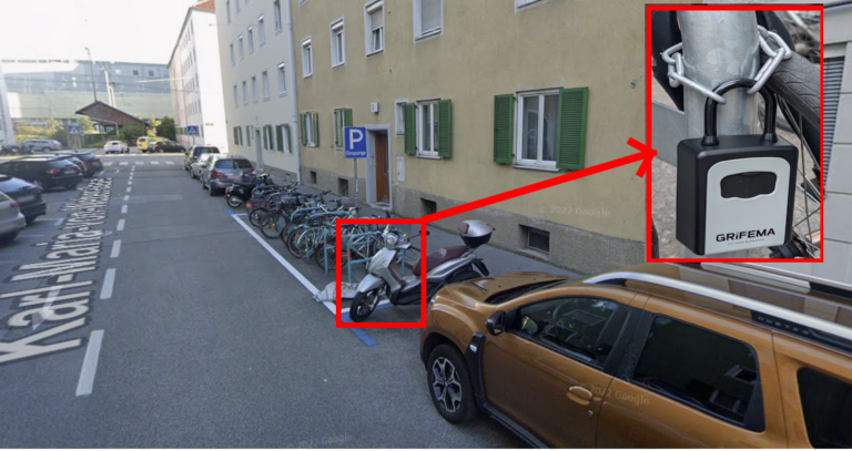- Der Schlüssel befindet sich in einem Schlüsseltresor (Sieht aus wie ein großes Vorhängeschloss) bei den Fahrradparkplätzen.