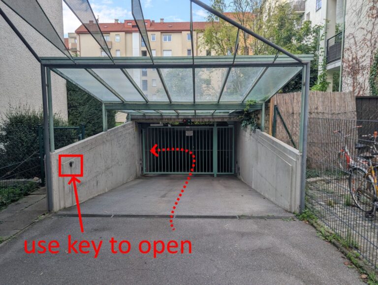 - Solltest du mit dem Auto kommen kannst du gerne unseren Parkplatz in der Tiefgarage verwenden (siehe Bilder). Dann einfach über die Rampe wieder zum Gebäudeeingang gehen und mit dem Lift in den 4. Stock fahren.