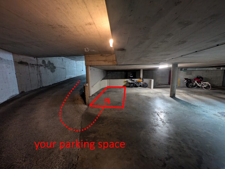 - If you are arriving by car, you are welcome to use our parking space in the underground garage (see pictures). Then simply walk back – up the ramp to the building entrance and take the elevator to the 4th floor.
